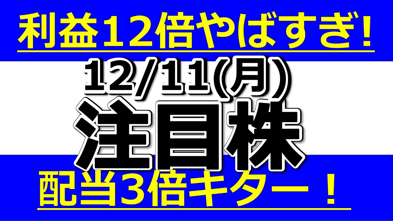 利益12倍やばすぎ!配当3倍キター!【12月11日(月)の注目株】は凄いですよね、、、株式優待の情報について語っているオススメのユーチューバー。