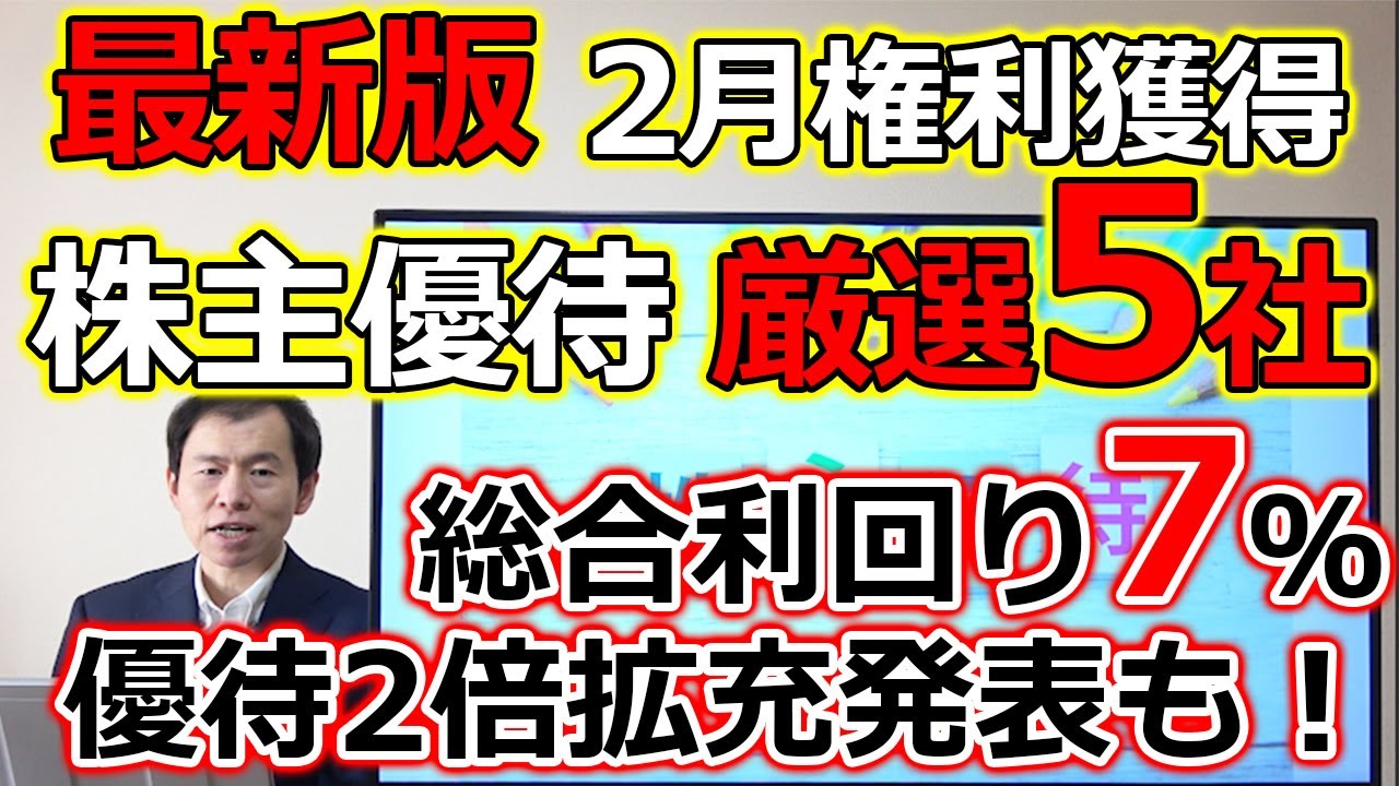 【最新版】総合利回り5%や7%超え!株主優待2倍拡充も!2月権利獲得の株主優待 厳選5社は凄いですよね、、、株式優待の情報について語っているオススメのユーチューバー。