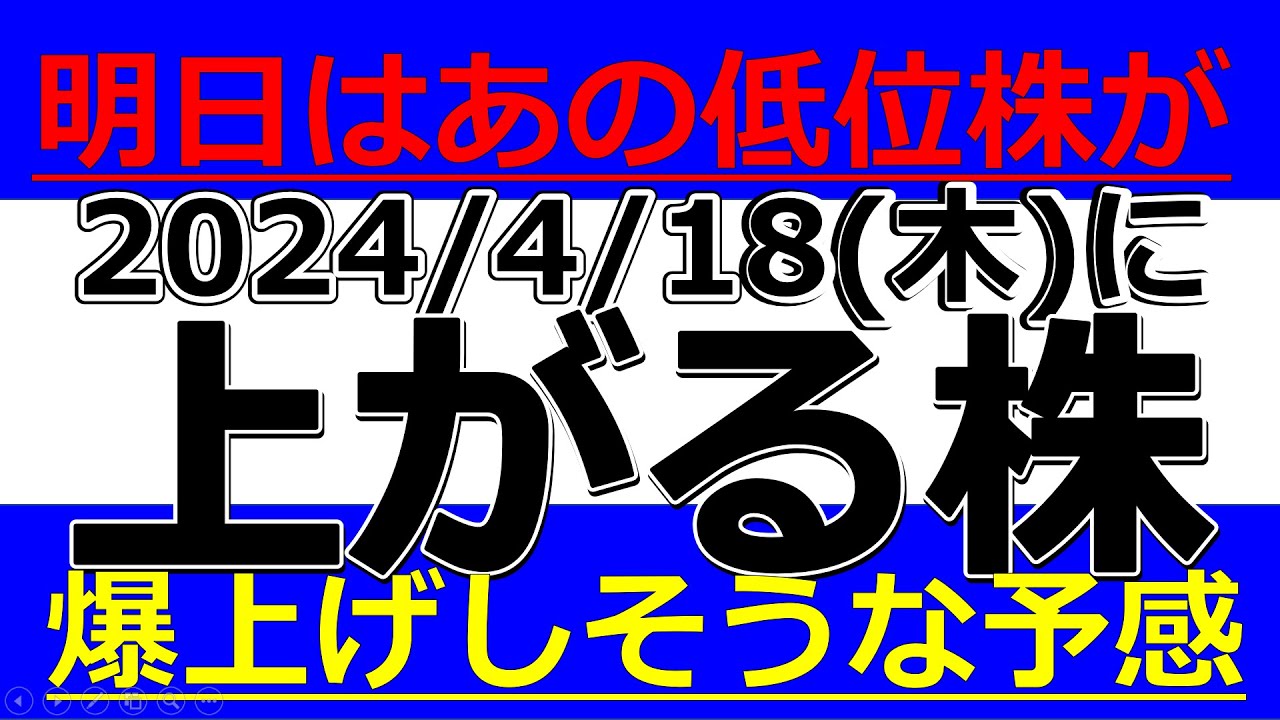 2024/4/18(木)に株価が上がる株、株式投資・デイトレの参考に。明日はあの低位株が爆上げしそうな予感は凄いですよね、、、株式優待の情報について語っているオススメのユーチューバー。