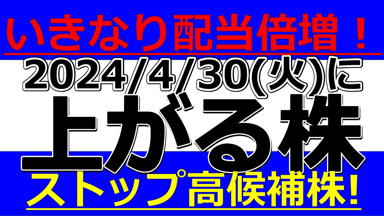 2024/4/30(火)に株価が上がる株、株式投資・デイトレの参考に。いきなり配当倍増!ストップ高候補株!は凄いですよね、、、株式優待の情報について語っているオススメのユーチューバー。