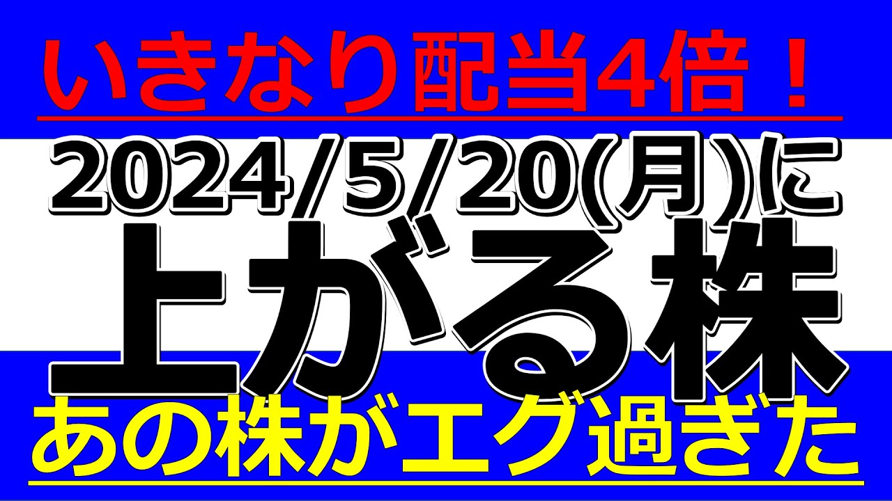 2024/5/20(月)に株価が上がる株、株式投資・デイトレの参考に。いきなり配当4倍!あの株がエグ過ぎた!は凄いですよね、、、株式優待の情報について語っているオススメのユーチューバー。