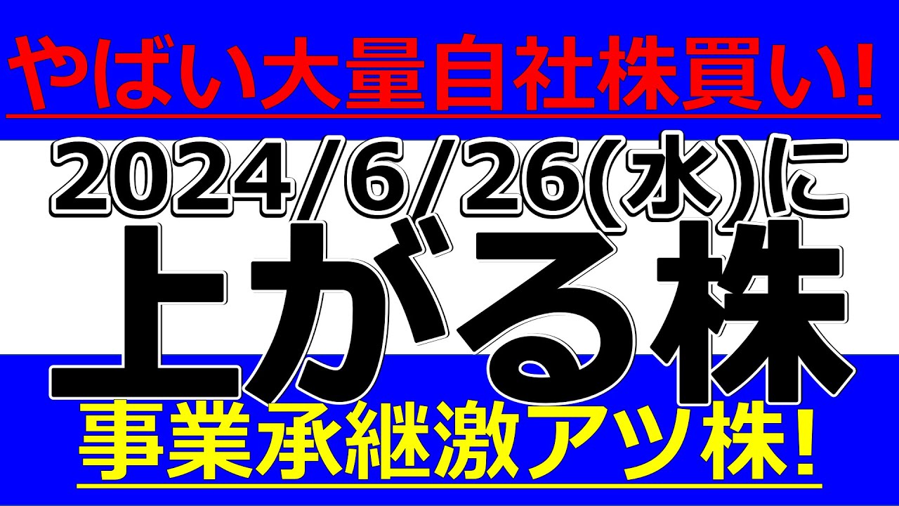 2024/6/26(水)に株価が上がる株、株式投資・デイトレの参考に。やばい大量自社株買い!事業承継激アツ株!は凄いですよね、、、株式優待の情報について語っているオススメのユーチューバー。