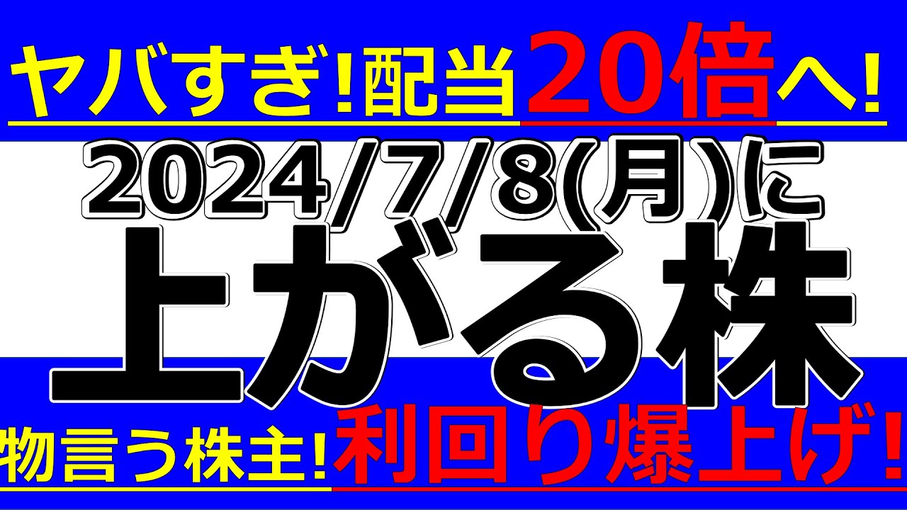 2024/7/8(月)に株価が上がる株、株式投資・デイトレの参考に。ヤバすぎ!配当20倍へ!物言う株主で利回り爆上げキター!は凄いですよね、、、株式優待の情報について語っているオススメのユーチューバー。