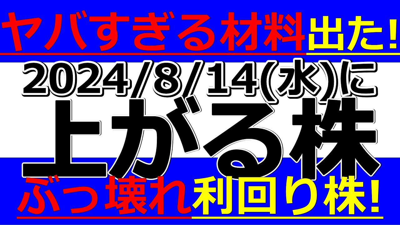 2024/8/14(水)に株価が上がる株、株式投資・デイトレの参考に。ヤバすぎる材料出た!ぶっ壊れ利回り株!は凄いですよね、、、株式優待の情報について語っているオススメのユーチューバー。