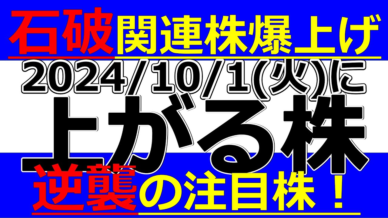 2024/10/1(火)に株価が上がる株、株式投資・デイトレの参考に。石破関連株爆上げキテル!石破ショックから逆襲の注目株!は凄いですよね、、、株式優待の情報について語っているオススメのユーチューバー。