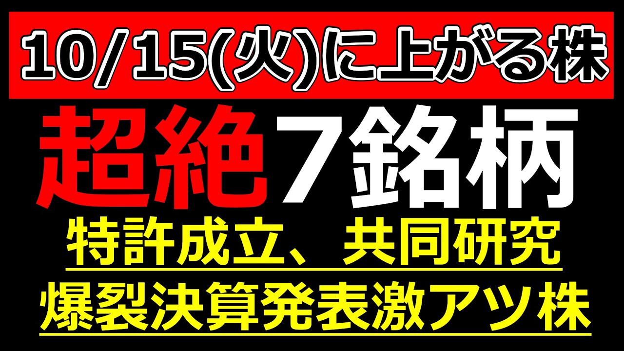 【10/15(火)に株価が上がる株・明日上がる株・株式投資日本株最新情報】超絶材料出した厳選7銘柄!特許成立、共同研究、爆裂決算などは凄いですよね、、、株式優待の情報について語っているオススメのユーチューバー。