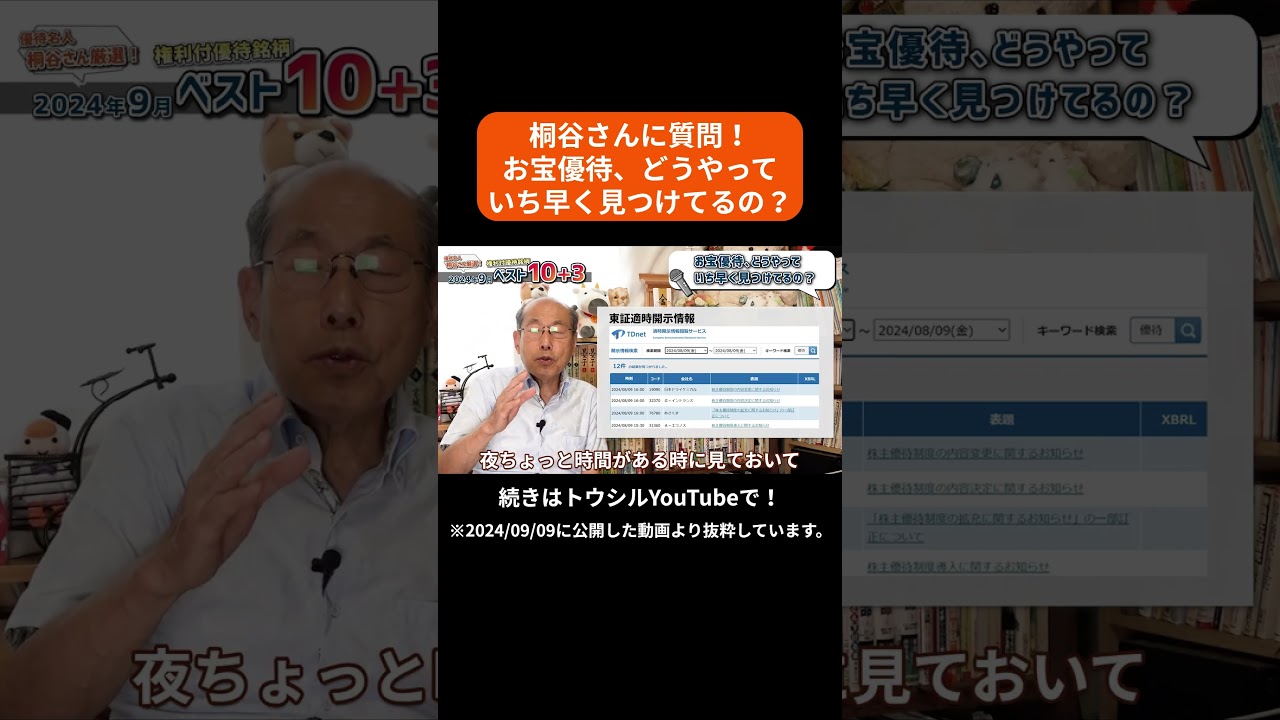 桐谷さん厳選!2024年9月権利付き優待ベスト10+3「お宝優待の検索方法:東証適時開示情報」#shorts #桐谷さん #株主優待 #優待生活は凄いですよね、、、株式優待の情報について語っているオススメのユーチューバー。