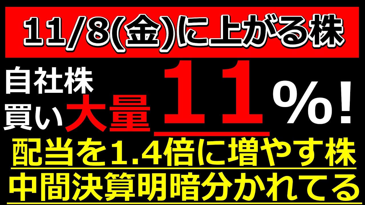 大量自社株買い11%で爆上げ株【11/8(金)に株価が上がる株・明日上がる株・株式投資日本株最新情報】は凄いですよね、、、株式優待の情報について語っているオススメのユーチューバー。