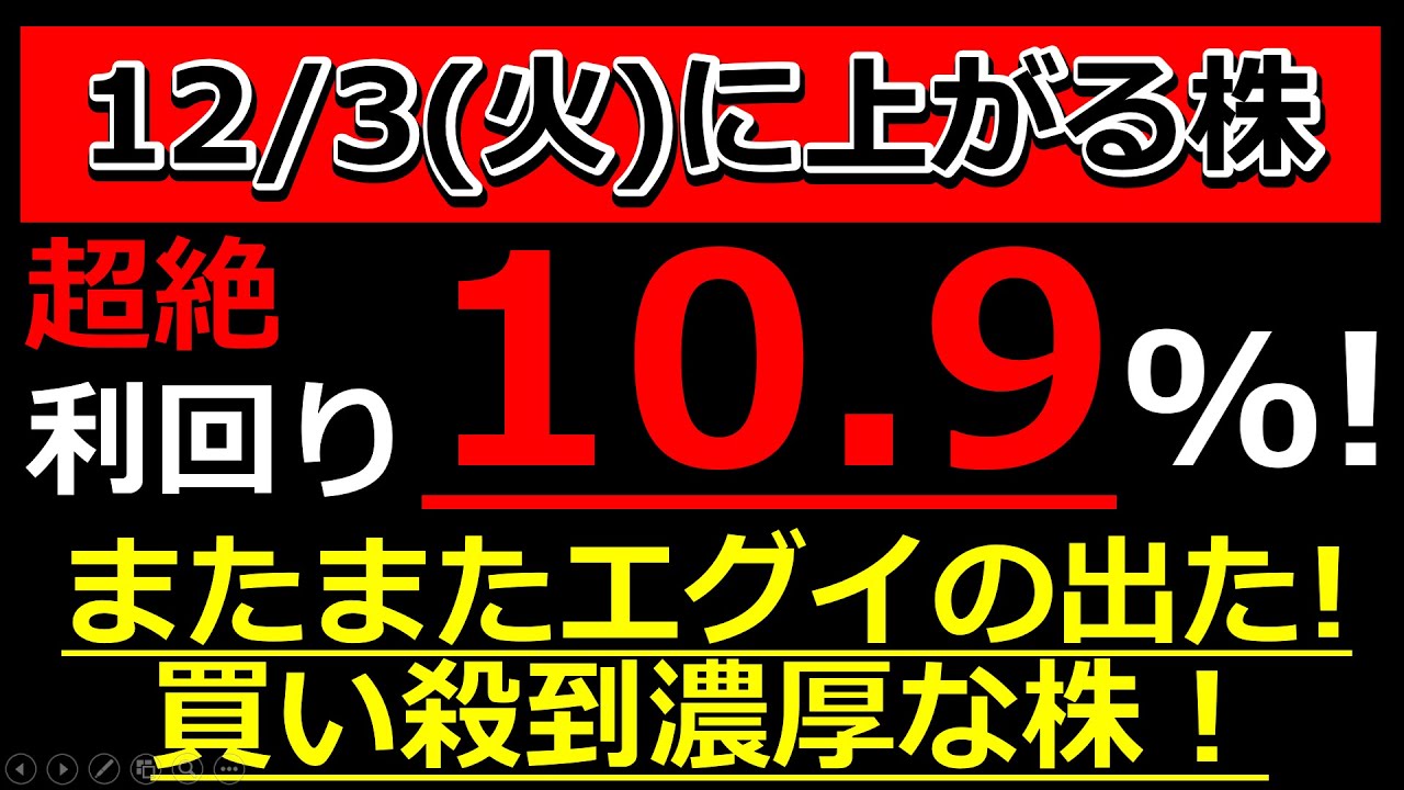 超絶利回り10.9%!またまたエグイの出で爆上げ濃厚な株!【12/3(火)に株価が上がる株・明日上がる株・株式投資日本株最新情報】は凄いですよね、、、株式優待の情報について語っているオススメのユーチューバー。