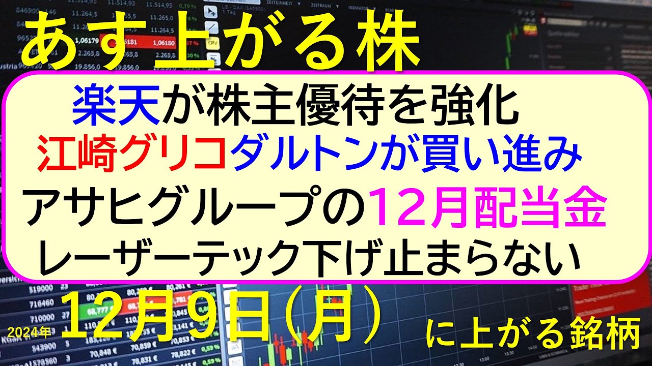 あす上がる株 2024年12月9日(月)に上がる銘柄。楽天が株主優待を強化。江崎グリコをダルトン買い進み。レーザーテック下げ止まらない。アサヒ配当金~最新の日本株情報。高配当株の株価やデイトレ情報~は凄いですよね、、、株式優待の情報について語っているオススメのユーチューバー。