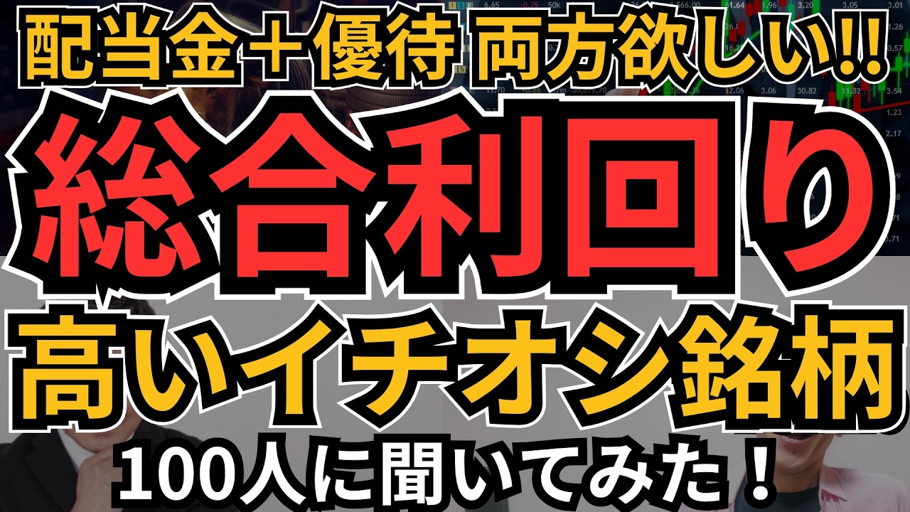 【配当+株主優待】総合利回りが高いイチオシ銘柄、個人投資家100人に聞いてみた!配当利回り5%の高配当株、優待利回り200%の人気優待株など盛り沢山!は凄いですよね、、、株式優待の情報について語っているオススメのユーチューバー。