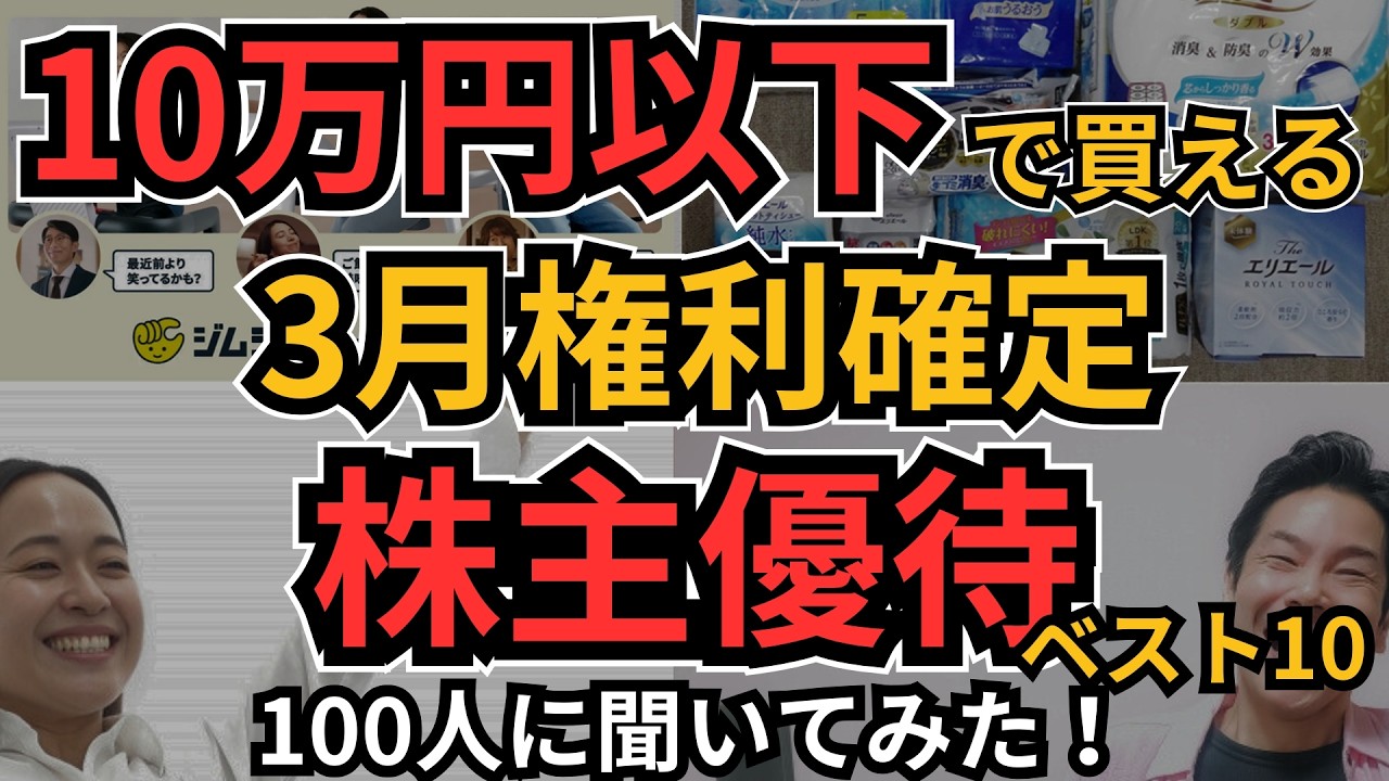 【10万以下×3月優待】今買うべき!10万円以下で買える3月権利確定のイチオシ優待銘柄、100人に聞いてみた!配当4%や総合利回り10%超も!株価急落で仕込み時到来!?は凄いですよね、、、株式優待の情報について語っているオススメのユーチューバー。
