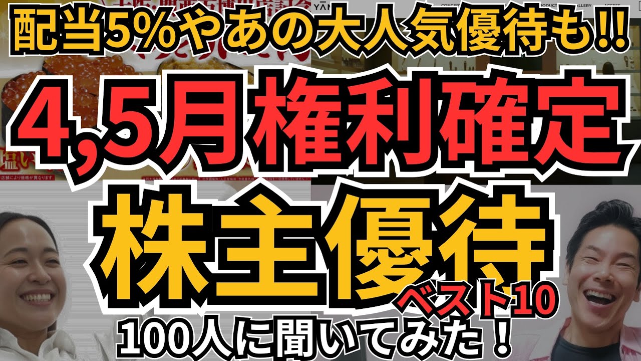 【4月5月の株主優待】今買うべきイチオシ4月5月権利確定の優待銘柄、100人に聞いてみた!高配当5%や大人気優待銘柄も!株価急落でチャンス到来!は凄いですよね、、、株式優待の情報について語っているオススメのユーチューバー。