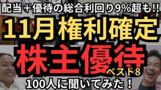 投資【お金返して!】【11月の株主優待】11月権利確定の株主優待、必ず押さえるべき優待銘柄は?総合利回り5~9%ざくざく!100人に聞いてみた!超お得な優待、ベスト8発表!これは私も欲しい! 【11月の株主優待】11月権利確定の株主優待、必ず押さえるべき優待銘柄は?総合利回り5~9%ざくざく!100人に聞いてみた!超お得な優待、ベスト8発表!これは私も欲しい!は凄いですよね、、、株式優待の情報について語っているオススメのユーチュ... 2024.11.15投資