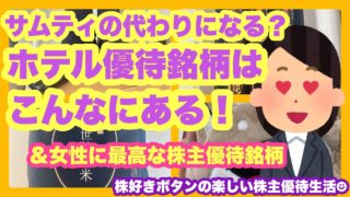 【株主優待生活】ホテル優待銘柄たくさん教えてもらいました/女性におすすめの優待銘柄は凄いですよね、、、株式優待の情報について語っているオススメのユーチューバー。 前はブランドのレンタルの情報を整理していましたが、儲かって無さそうなので...