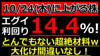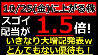 投資【お金返して!】いきなり配当が1.5倍へ!いきなり大増配発表!スゴイ利回りの優待発表した株も【10/25(金)に株価が上がる株・明日上がる株・株式投資日本株最新情報】 いきなり配当が1.5倍へ!いきなり大増配発表!スゴイ利回りの優待発表した株も【10/25(金)に株価が上がる株・明日上がる株・株式投資日本株最新情報】は凄いですよね、、、株式優待の情報について語っているオススメのユーチューバー。 前は... 2024.10.25投資