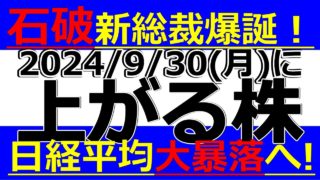 【お金返して!】2024/9/30(月)に株価が上がる株、株式投資・デイトレの参考に。石破新総裁爆誕!日経平均大暴落へ!石破ショック!
